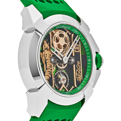 The Jacob & Co V2 CR7 Epic X collection  is an iconic timepiece. With a 44 mm stainless steel case, X-shaped lugs, and a skeleton movement (Caliber JCAM45), it embodies precision and style. The vertical pillars on the dial represent Cristiano Ronaldo and the CR7 brand, showcasing dynamic poses and engraved logos. The football-shaped skeleton barrel cover and a silver-printed image of Ronaldo on the caseback add a sporty touch. The stainless steel case, green aluminum details, and a green honeycomb rubber strap enhance its aesthetics. Water-resistant up to 50 meters, this collaboration seamlessly blends horological excellence with the spirit of the football legend. This timepiece is brand new from 2024 and comes complete with its original box and papers.